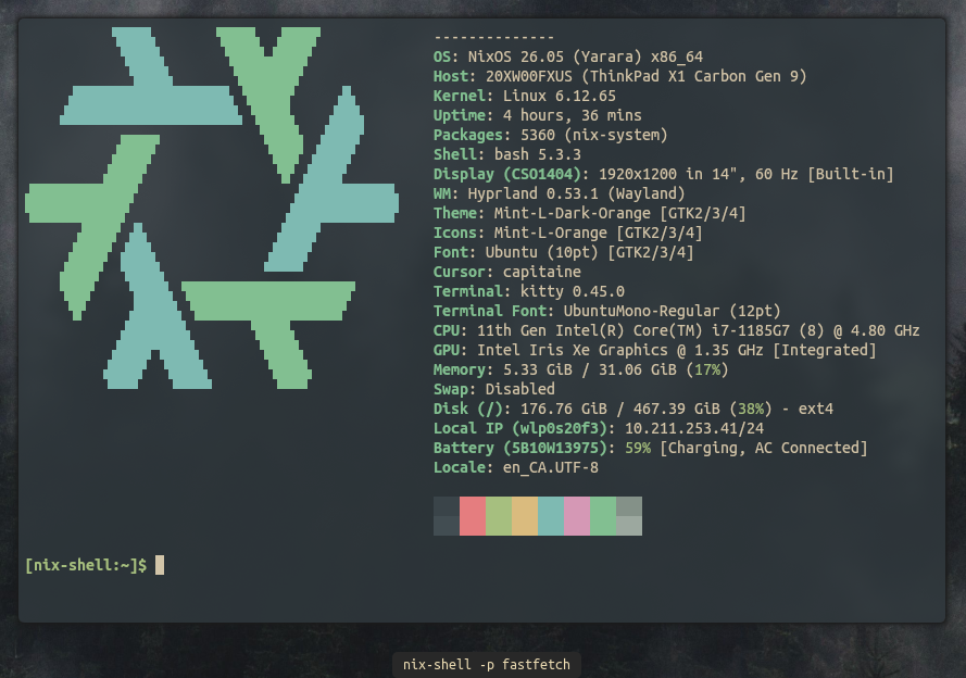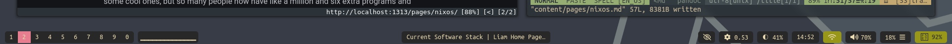Ah yes, this site used to have semi current information on what my setup was like. Currently, much like the previous updates 5 years ago, I am on NixOS. I had a brief haitus but I’ll talk about that later. The rest of the stack isn’t too outlandish or surprising: