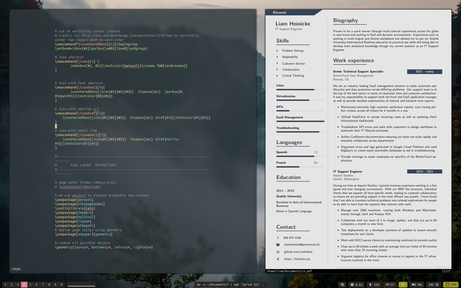 The other thing I like about this is it’s a bit lighter I believe. It has a built in live ‘watch’ command as they call it where it opens a Zathura window and every time the document saves it just live updates. You don’t have to LaTeX recompile all the time and it’s instant instead of the 1 to 4 seconds the other one takes.