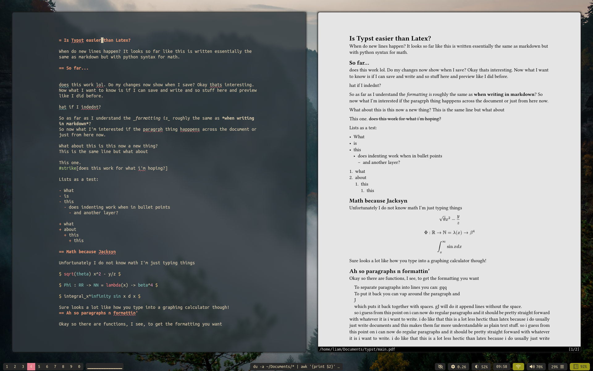I do think there are probably limits in what you can do, I’m not sure for example if I could remake my resume exactly in Typst yet but maybe? Honestly why try though, I’ll keep using my LaTeX template for that but I’ll make a Typst one next time I need to have a different layout for the learning. Making simple word documents though are now as easy as typing and saving. There are some simple starter templates from their site which work well, you can just run ’typst @ whatever template’ essentially and it makes a new folder with a main.typ file you can just start clackin’ away in.