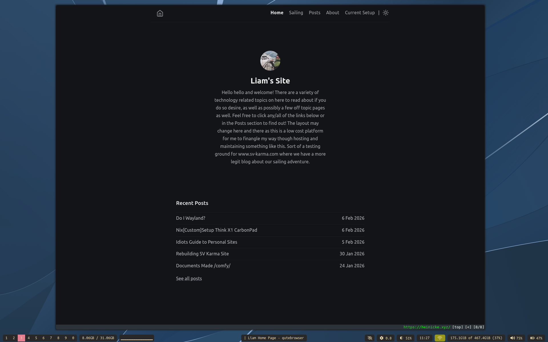 While simple, I gotta have some eye candy. A lot of this is defined here. Gaps, I wish I could change this on the fly (think Mango? hmm) as well as the slight rounding of the corners and some blur/shadow stuff. In Wayland I like this works without having another compositor running like Picom or Compiz where you have to define and get that working else where.