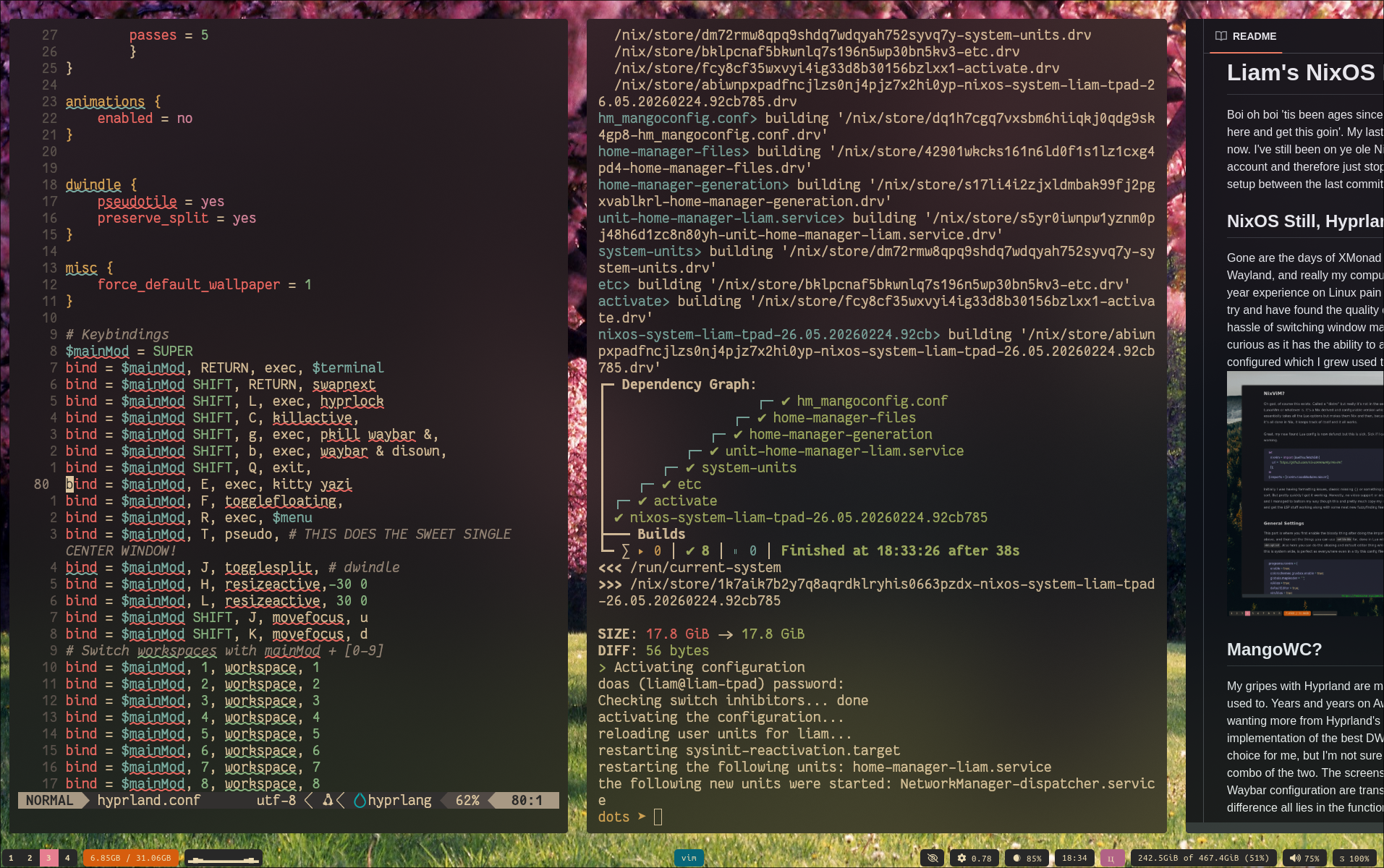 That all being said, the fact that Hyprland is so easy to configure is in part due to it being a bit set in it’s ways. Like i3 before it, these manual tiling window managers sorta anger me. Probably because I learned initially with AwesomeWM which is tag and layout based and then moved to Xmonad where I was editing source code to essentially mimic what I had gotten used to with AwesomeWM.
