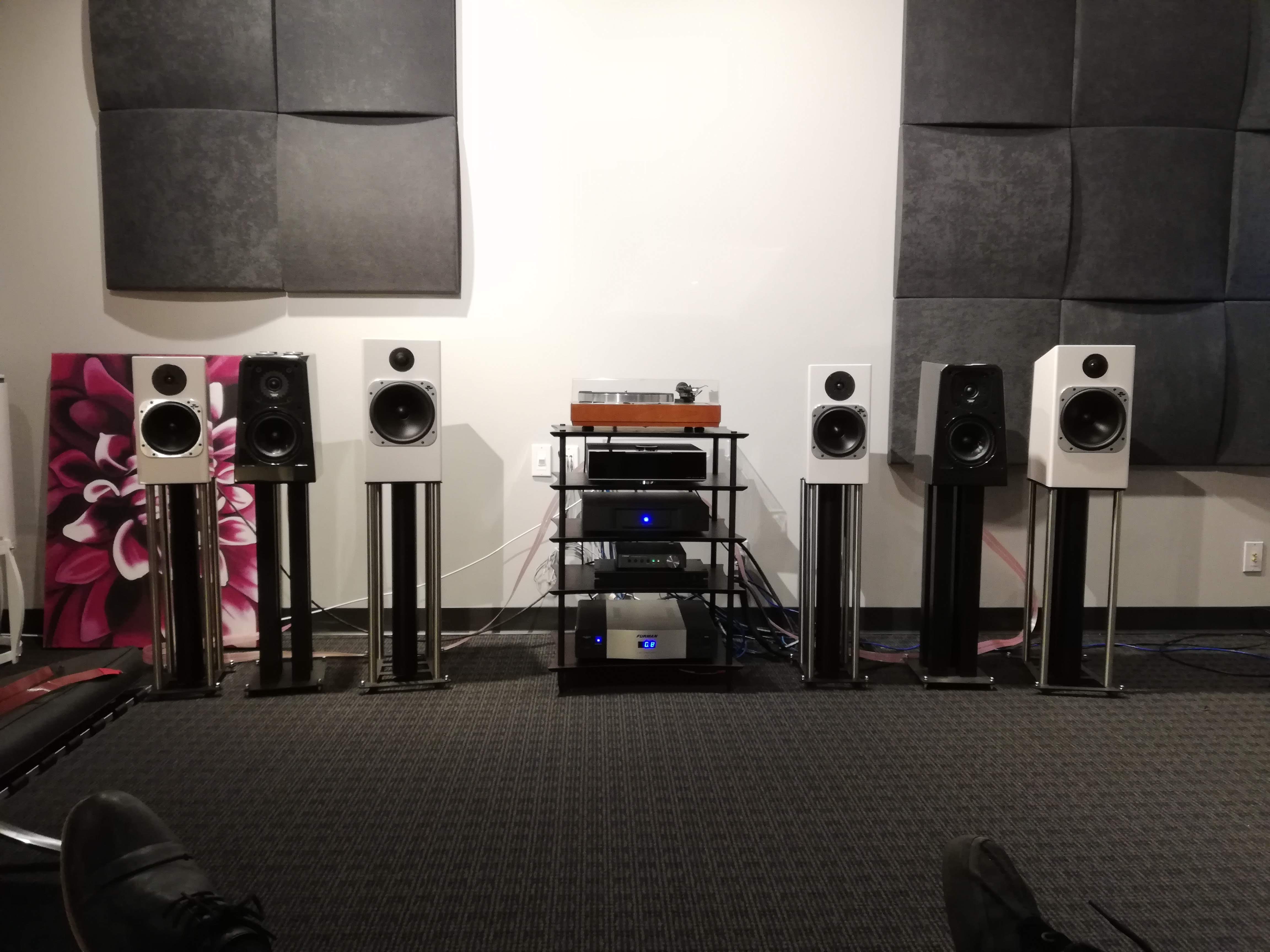 I was there for a few hours and we listened to a range of sizes and designs. All are built with what I think are Fostex drivers? Maybe Mark Audio drivers, but then the boxes are really where the differences lay in this design of speaker.